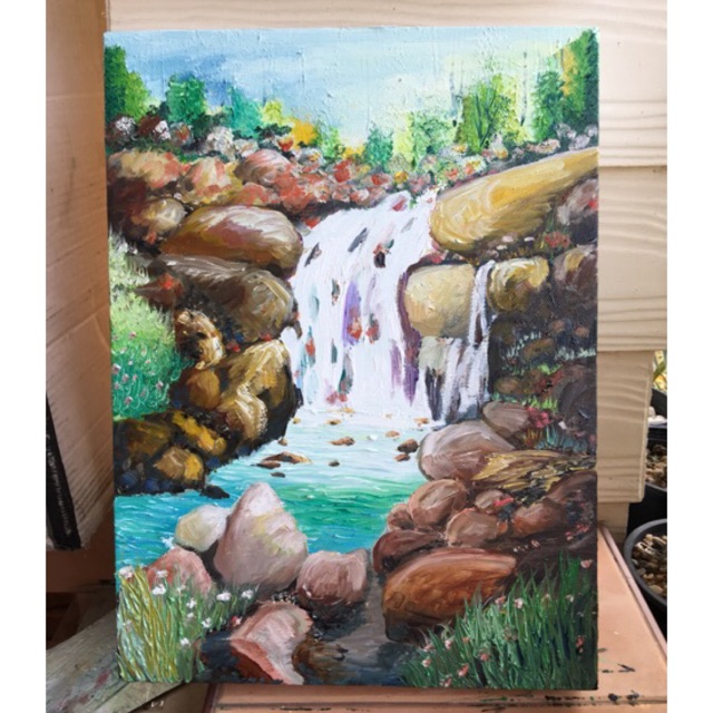 รูปวาดตาน้องไวน์ #ภาพวาดสีน้ำมัน ขนาด 30×40 cm #ภาพวิวน้ำตก #ผ้าใบเฟรม …