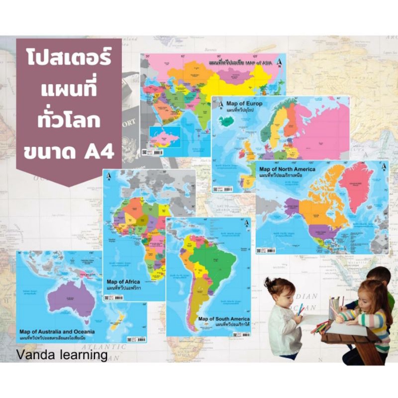 โปสเตอร์แผนที่ประเทศทั่วโลก ทุกทวีป ขนาด A4 ทวีปเอเชีย ยุโรป อเมริกา …